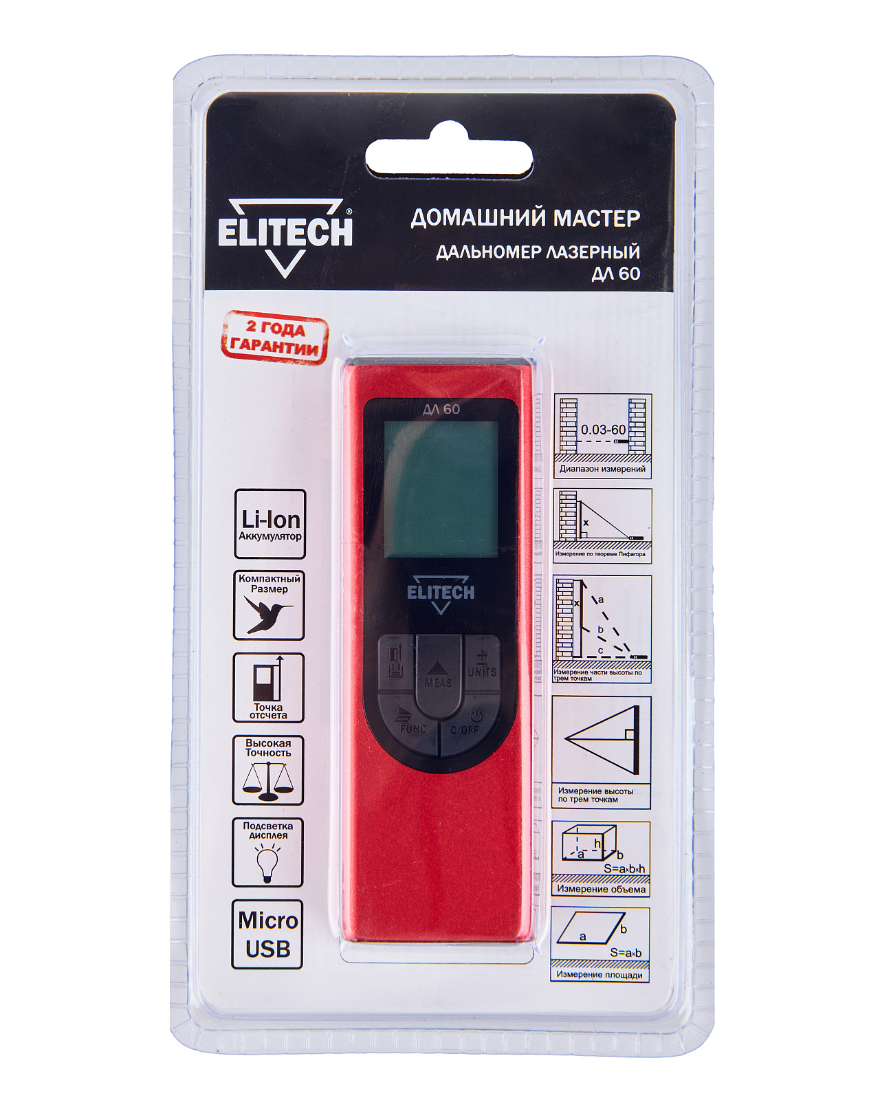 Лазерный дальномер ELITECH ДМ ДЛ 60 предназначен для быстрого измерения расстояний на дальности до 60 метров. Он точнее обычной рулетки при измерении расстояния более 8 метров.