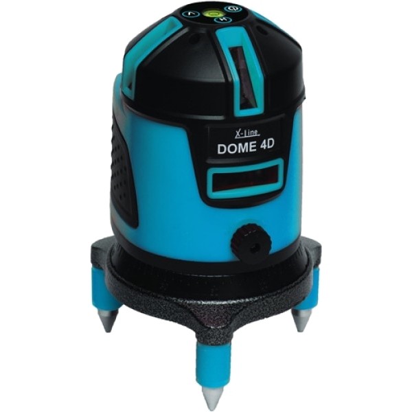 Построитель лазерных плоскостей X-Line Dome 4D X00127 строит четыре вертикальные лазерные линии пересекающиеся "над головой" и одну линию в горизонтальной плоскости, образуя один лазерный крест перед нивелиром, а также точку отвеса вниз. С помощью мембранной клавиатуры можно выставить необходимую комбинацию лучей. Модель оснащена самовыравнивающимся компенсатором с рабочим диапазоном ±3 градуса. При большем отклонении лазерный луч начинает мигать и звучит характерный сигнал. Также сверху на корпусе инструмента имеется пузырьковый уровень для предварительного ручного выравнивания.