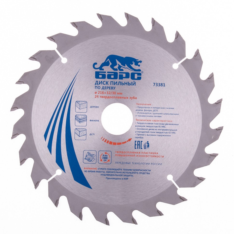 Артикул 73381 Посадочный диаметр, мм: 30 Бренд: БАРС Диаметр диска, мм 216 Количество зубьев, шт: 24 Базовая единица шт -