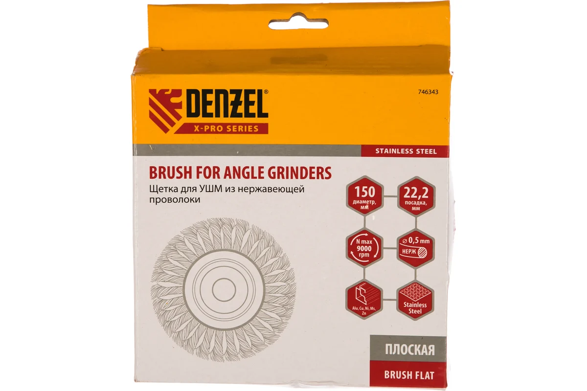 Плоская щетка для УШМ Denzel 746343 диаметром 150 мм, с посадкой 22,2 мм, с щетиной из крученой нержавеющей проволоки 0,5 мм, предназначена для снятия толстого верхнего слоя с металлических, деревянных, бетонных поверхностей. Удаляет загрязнения, ржавчину, старые лакокрасочные покрытия, заусенцы, окалину с ровных поверхностей и в труднодоступных местах. Оптимальна для обработки изделий из нержавеющей стали, а также зачистки сварных швов. Щетку устанавливают на фланец углошлифовальной машины, что удобно для выполнения большого объема работ, не требующих частой смены насадок. Рекомендуемая максимальная скорость вращения 9000 об/мин. Во время работы обязательно использование средств индивидуальной защиты. Щетка будет полезна на строительной площадке, производственном предприятии, а также пригодится в быту.