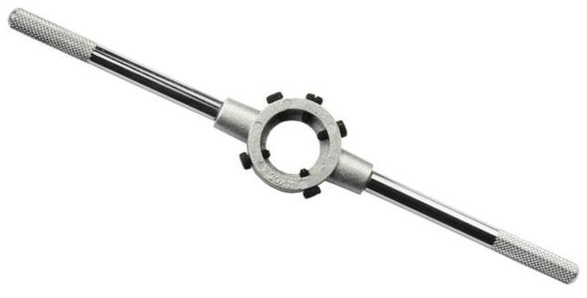 Держатель для плашек Техмаш. Используется для работы с плашками М10-М11. Стопорные винты надёжно фиксируют плашку. Держатель оснащен стальными рукоятками с накаткой. Поставляется в блистерной упаковке.