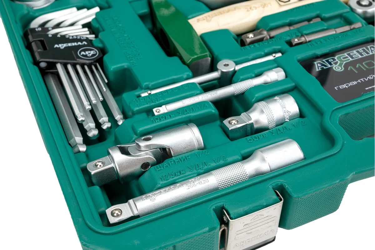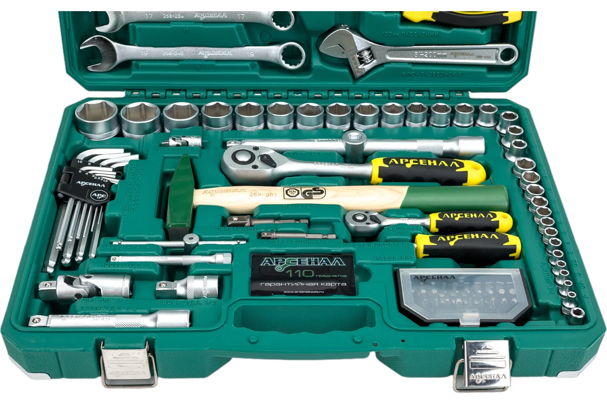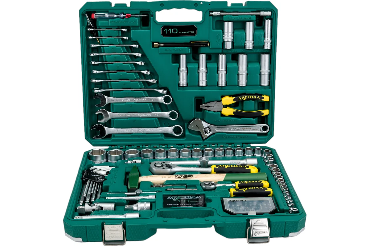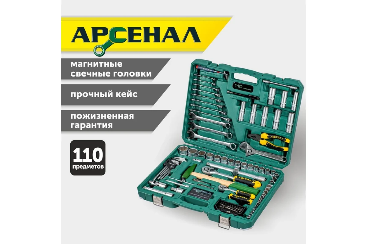 Набор инструментов 110 предметов Арсенал АА-С1412К110 отличный вариант для профессионалов, расширенная комплектация головок, в том числе глубоких. Большой подбор ключей комбинированных и шестигранных, разводной ключ,молоток и пассатижи. В первую очередь должны обратить свое внимание на этот набор те, кто хочет иметь большую комплектацию с отличными возможностями самостоятельного ремонта любых узлов и механизмов. Биты идут в отдельном кейсе - сложно потерять, удобно переносить. Сталь, из которой изготовлен инструмент, легирована хромом и ванадием с нанесением никелевого покрытия. Крепкий кейс с металлическими углами выдержит ударные нагрузки. Наборы инструментов Арсенал имеют пожизненную гарантию. Арсенал - всегда качественный инструмент и надежные кейсы.