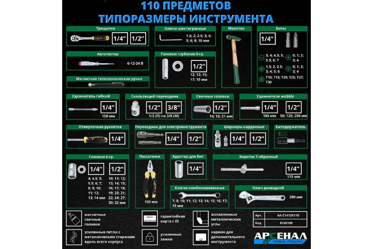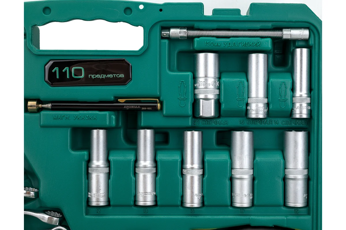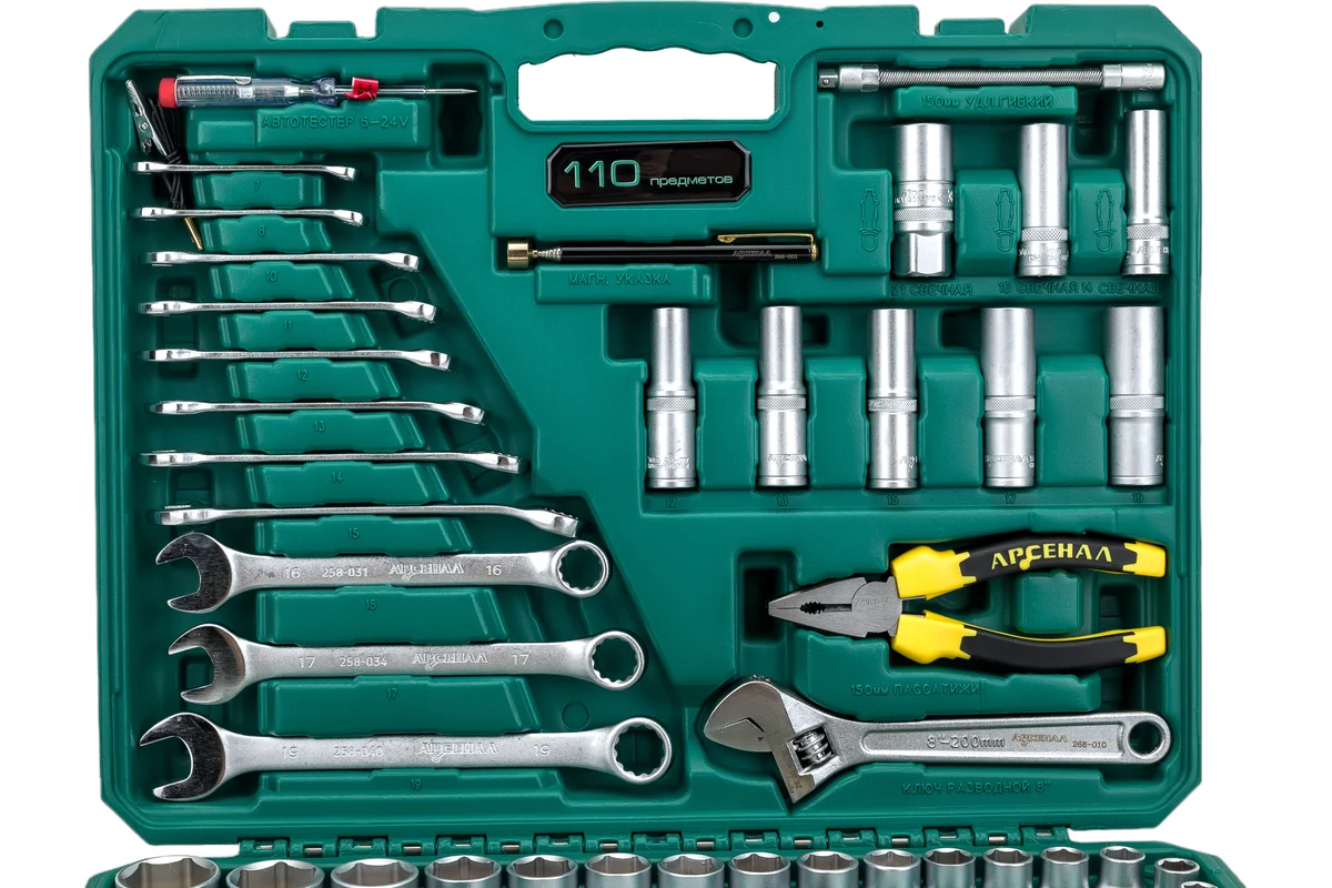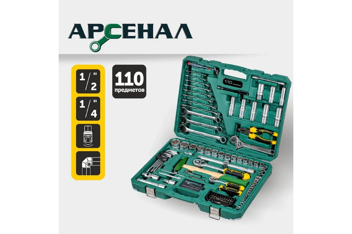 Набор инструментов 110 предметов Арсенал АА-С1412К110 отличный вариант для профессионалов, расширенная комплектация головок, в том числе глубоких. Бол...
