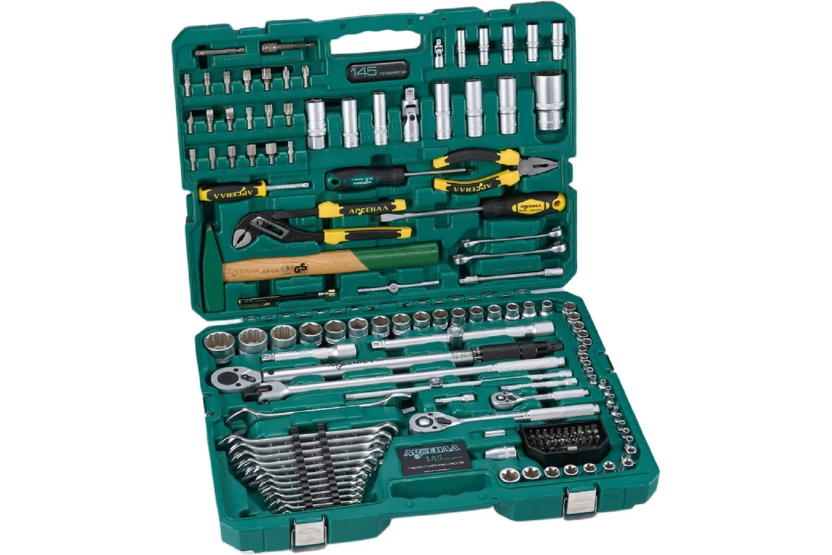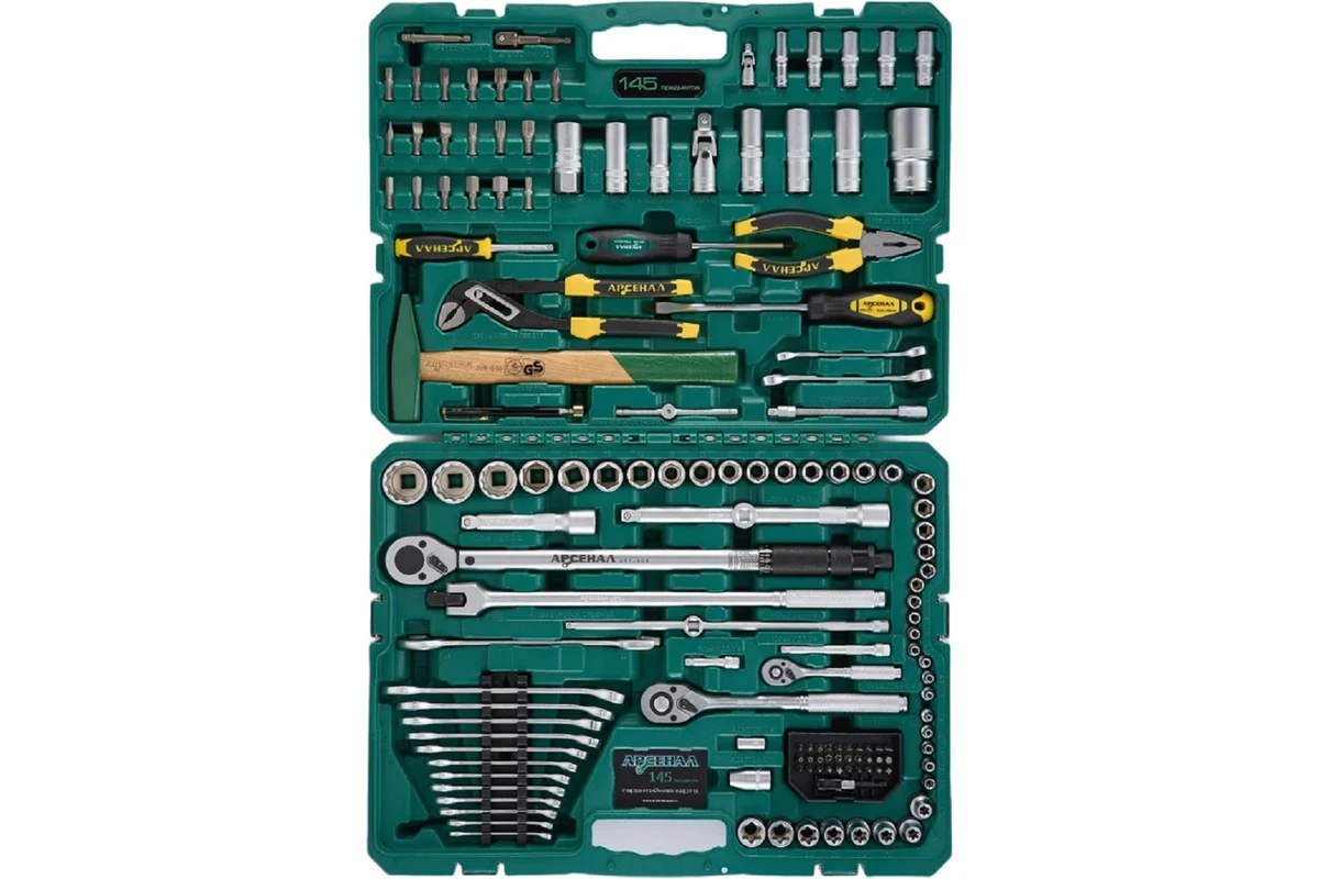Набор инструментов 145 предметов (C) Арсенал АА-С1412К145 разработан на основе множества мнений и отзывов профессионалов в области ремонта и обслуживания авто, специально для отечественного потребителя. В этом наборе вы найдете все необходимые инструменты для выполнения большинства ваших домашних и производственных задач. Набор включает в себя практически полный комплект бит, головок и удлинителей к ним необходимых для ремонта и обслуживания большинства узлов и агрегатов современных авто. Помимо обычных головок, в комплекте присутствуют и глубокие головки в самом востребованном ассортименте. Есть большие головки на 27, 30, 32, 36 мм и имеют 12-гранный удобный профиль. Биты поставляются в специальном кейсе , что делает их удобными для переноски и предотвращает их потерю. Есть практически всё, что необходимо для обслуживания автомобиля: набор комбинированных ключей; ключ динамометрический, молоток, головки торцевые, головки TORX E, трещотки на 1/4 и 1/2 дюйма, длинный вороток 430мм, переходники и отвертки, клещи переставные и пассатижи.