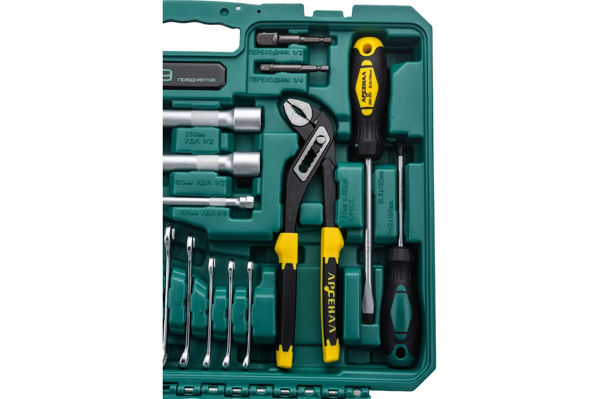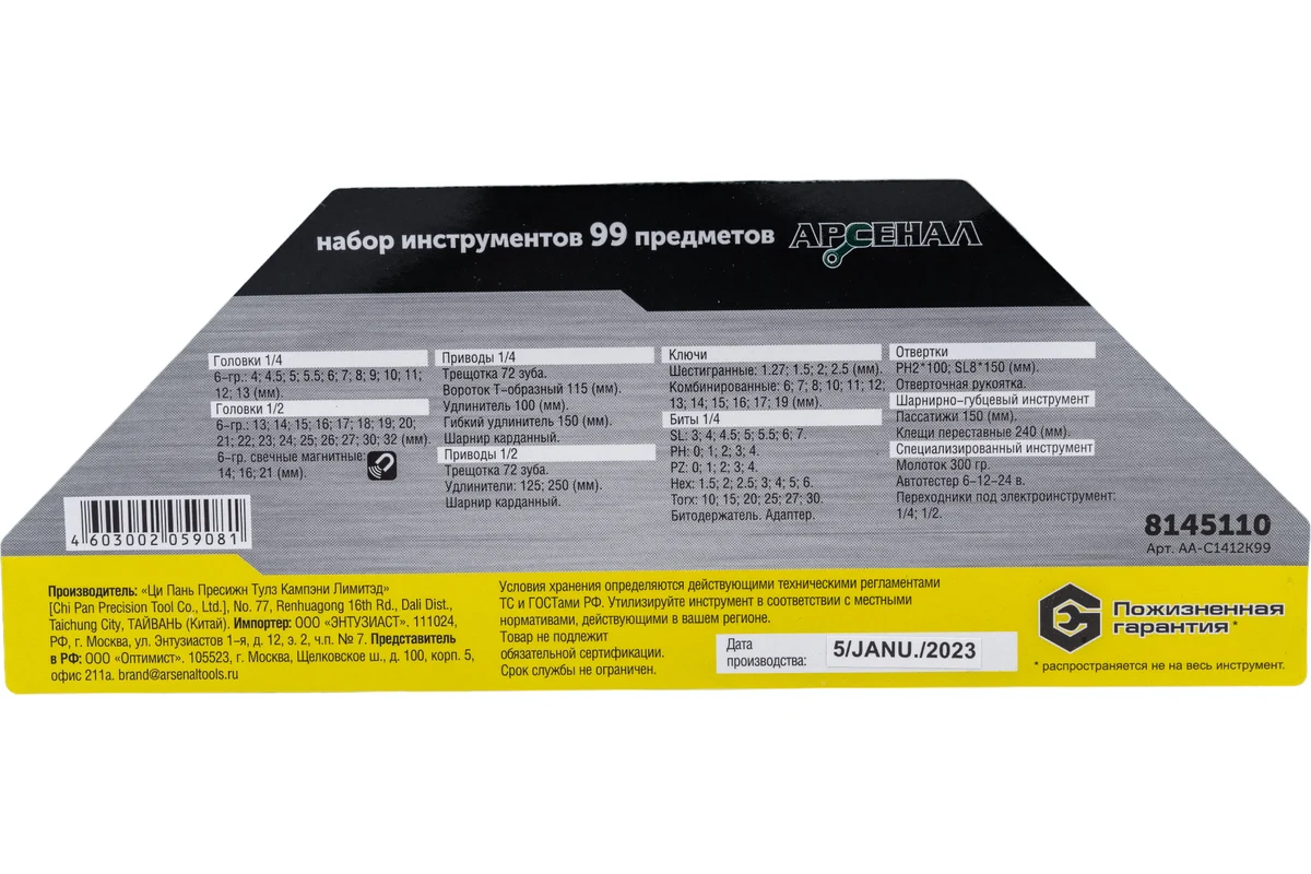 Артикул 8145110 Бренд: АРСЕНАЛ Материал: Cr-V Базовая единица шт Количество в наборе, шт: 99 шт Параметры упакованного товара