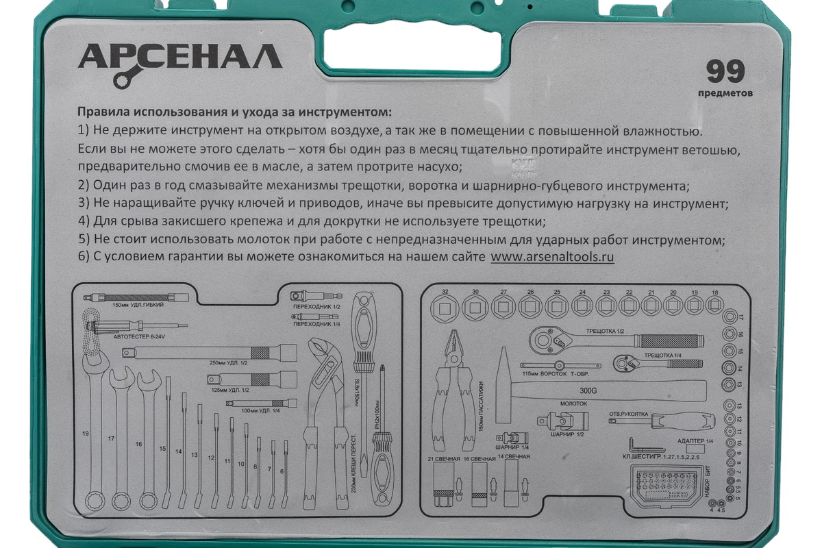 Набор инструментов 99 предметов Арсенал АА-С1412К99 идеально подходит для задач, которые стоят перед тем, кто предпочитает самостоятельно чинить свое авто. Хороший подбор головок и ключей позволит отремонтировать большинство узлов и агрегатов. А наличие шарнирно-губцевого инструмента и молотка снимет необходимость хранить отдельно эти не менее важные инструменты. Биты идут в отдельном кейсе - сложно потерять, удобно переносить. Сталь, из которой изготовлен инструмент, легирована хромом и ванадием с нанесением никелевого покрытия. Крепкий кейс с металлическими углами выдержит ударные нагрузки. Наборы инструментов Арсенал имеют пожизненную гарантию. Арсенал - всегда качественный инструмент и надежные кейсы.