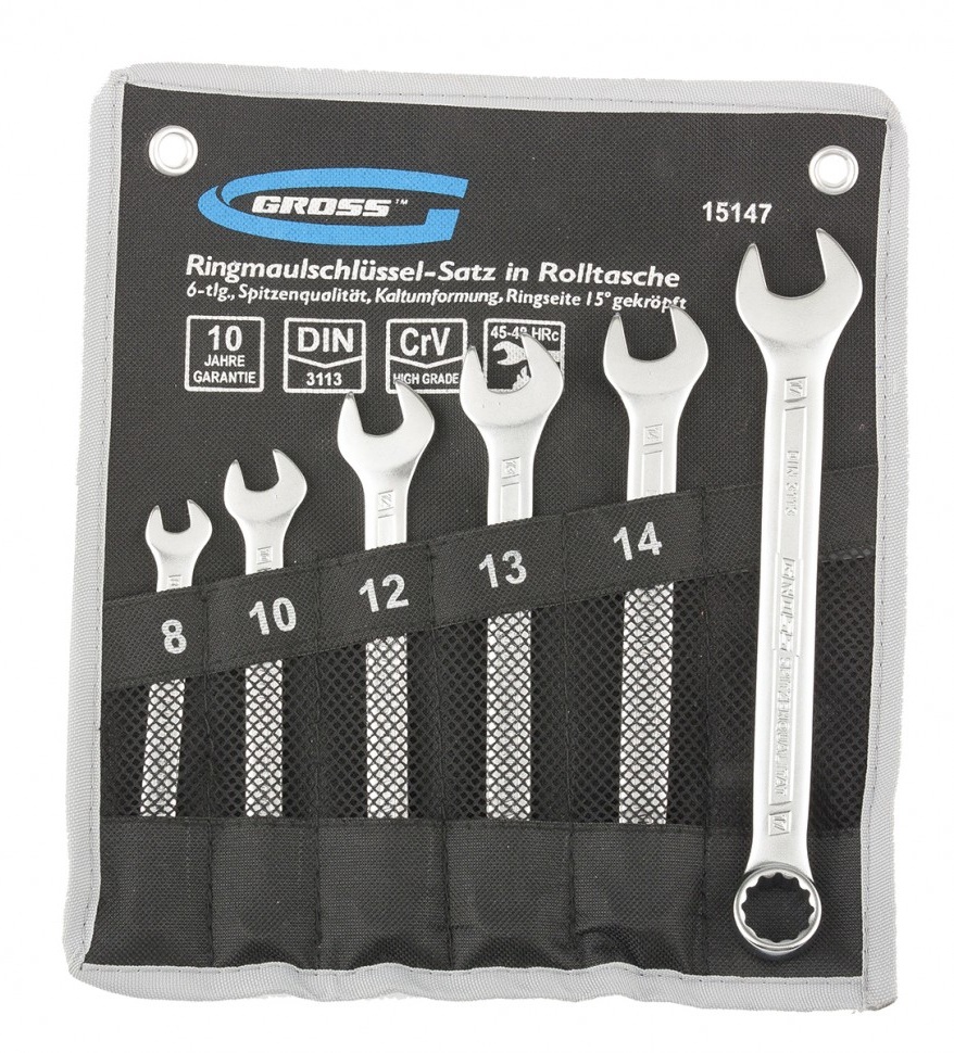 Набор комбинированных ключей 8-17 мм GROSS 6 шт. 15147 обладает коррозионной стойкостью и долговечностью. Включает двухсторонние ключи с открытым и кольцевым зевом, имеющим 12 граней, что обеспечивает больший захват рабочей поверхности. Все инструменты сделаны из качественной стали методом холодной штамповки, имеют хромоникелевое покрытие. Чехол обеспечивает удобство хранения набора.