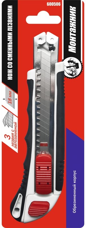 Нож со смен. лезв. обрезинен. Монтажник 3 лезвия 18мм с автозаменой., ABS+TPR,стопорн.винт сзади