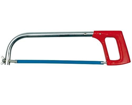 Ножовка имеет металлическую хромированную трубчатую раму и металлическую ручку.