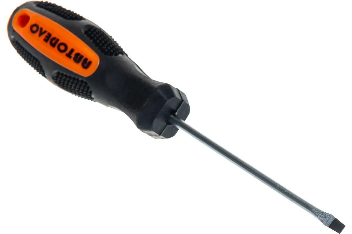 Отвёртка шлицевая АВТОДЕЛО. Изготовлена из хром-ванадиевой стали. Стержень закалён, рабочая часть намагничена. Длина стержня 75мм. Ширина рабочей части 5мм. Эргономичная обрезиненная ручка.