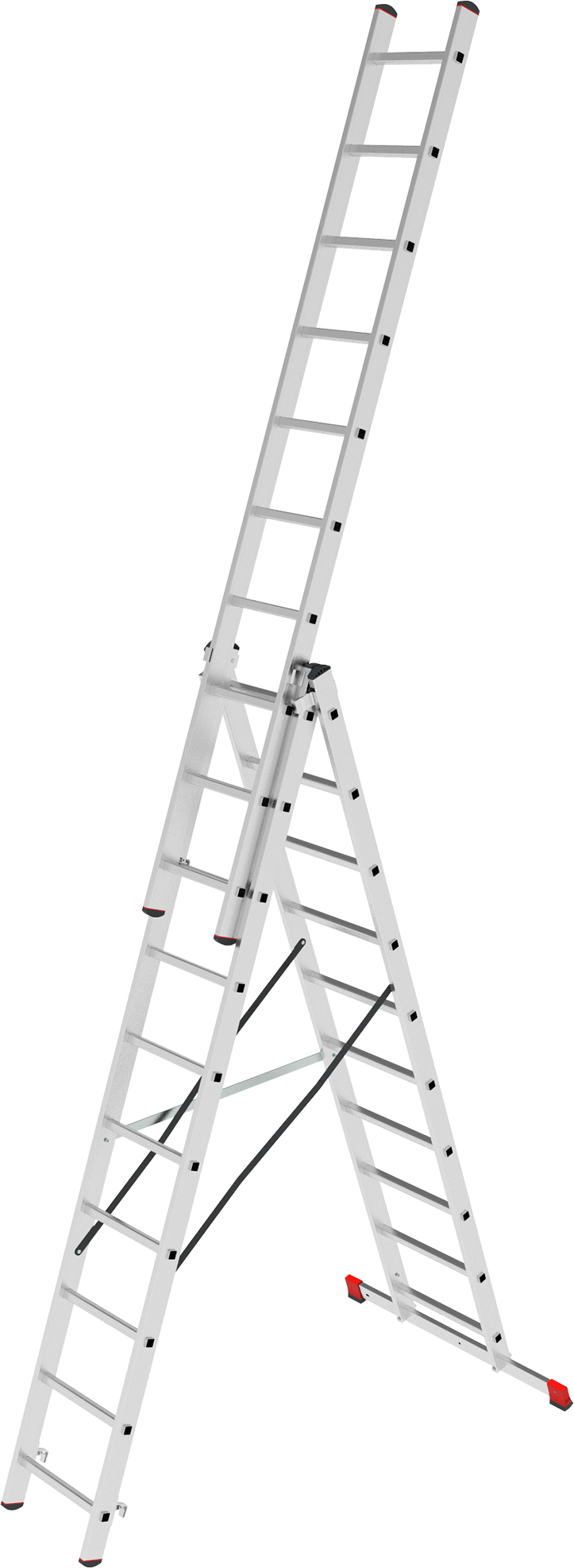 Трехсекционная лестница Новая Высота 3x10 широко применяется строительными, монтажными и ремонтными бригадами, которые выполняют работы на высоте. Модель легко раскладывается, что облегчает ее эксплуатацию. Для простоты транспортировки траверса закреплена болтами, что позволяет снимать ее и тем самым уменьшать ширину приспособления со 120 см до 35 см. Существует несколько вариантов раскладывания лестницы - приставная односекционная или стремянка (рабочая высота - 3.8 м), приставная раздвижная трехсекционная или стремянка с выдвинутой третьей секцией (рабочая высота - 5.3 м). Модель изготовлена из профиля 72х23х1.25 мм, что гарантирует долговечность несущей конструкции. Направляющие элементы укреплены дополнительными ребрами жесткости, что способствует увеличению максимальной нагрузки до 150 кг.