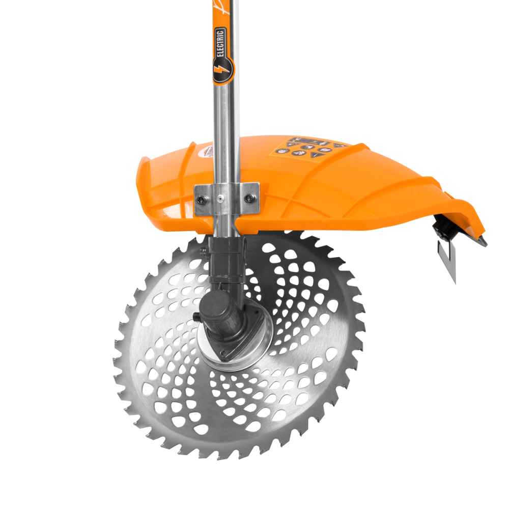 Пильный диск изготовлен из высокопрочной стали с твердосплавными напайками. 40 зубьев позволяют использовать его для кошения жесткой травы, кустарника и тонких стволов деревьев. Разъемный алюминиевый вал позволяет без использования инструментов разобрать триммер для компактного хранения.