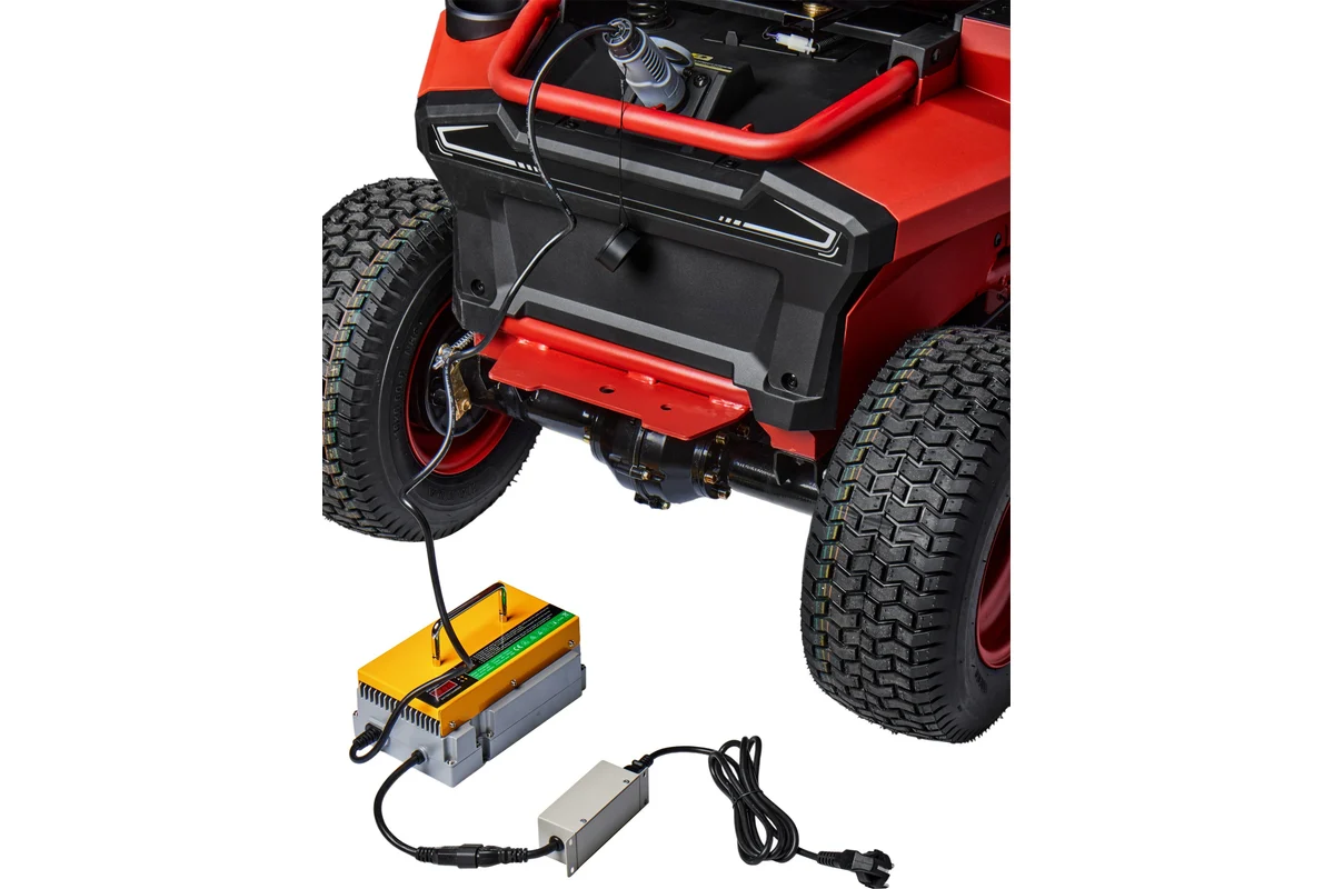 Садовый аккумуляторный райдер ELITECH МА 4876 оснащен свинцово-кислотным аккумулятором напряжением 48 В и емкостью 50 Ач и предназначен для кошения тр...
