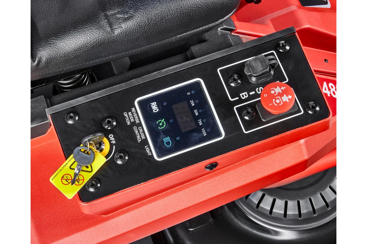 Садовый аккумуляторный райдер ELITECH МА 4876 оснащен свинцово-кислотным аккумулятором напряжением 48 В и емкостью 50 Ач и предназначен для кошения травы на систематически обрабатываемой и предварительно подготовленной поверхности (газон, лужайка, поле для игр и т.п.) с уклоном не более 15 градусов, на участках до 4000 кв.м, в стандартной комплектации с выбросом скошенной травы вбок, либо кошением травы в режиме мульчирования, когда скошенная трава является удобрением для вновь растущей.