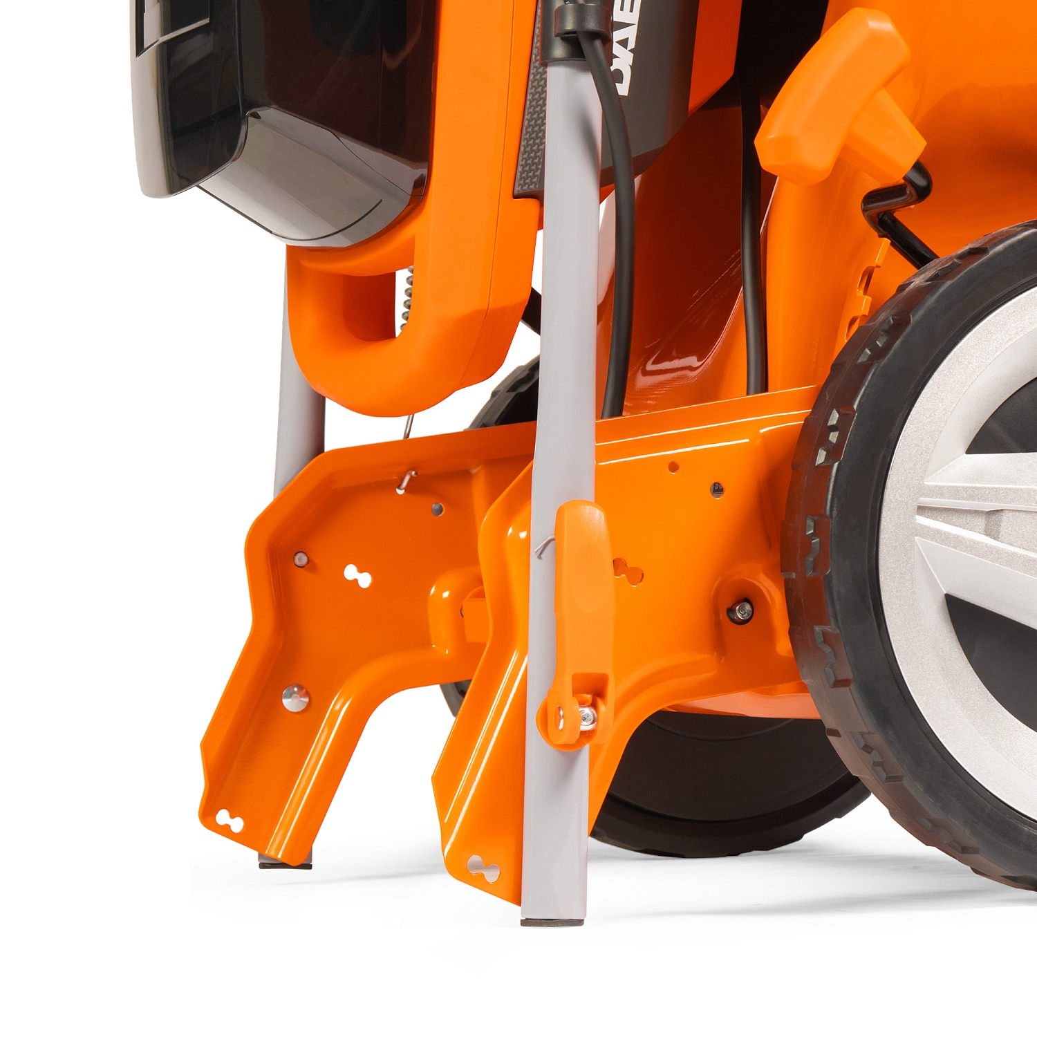 Специальная конструкция корпуса и складная рукоятка позволяют компактно хранить газонокосилку в вертикальном положении.