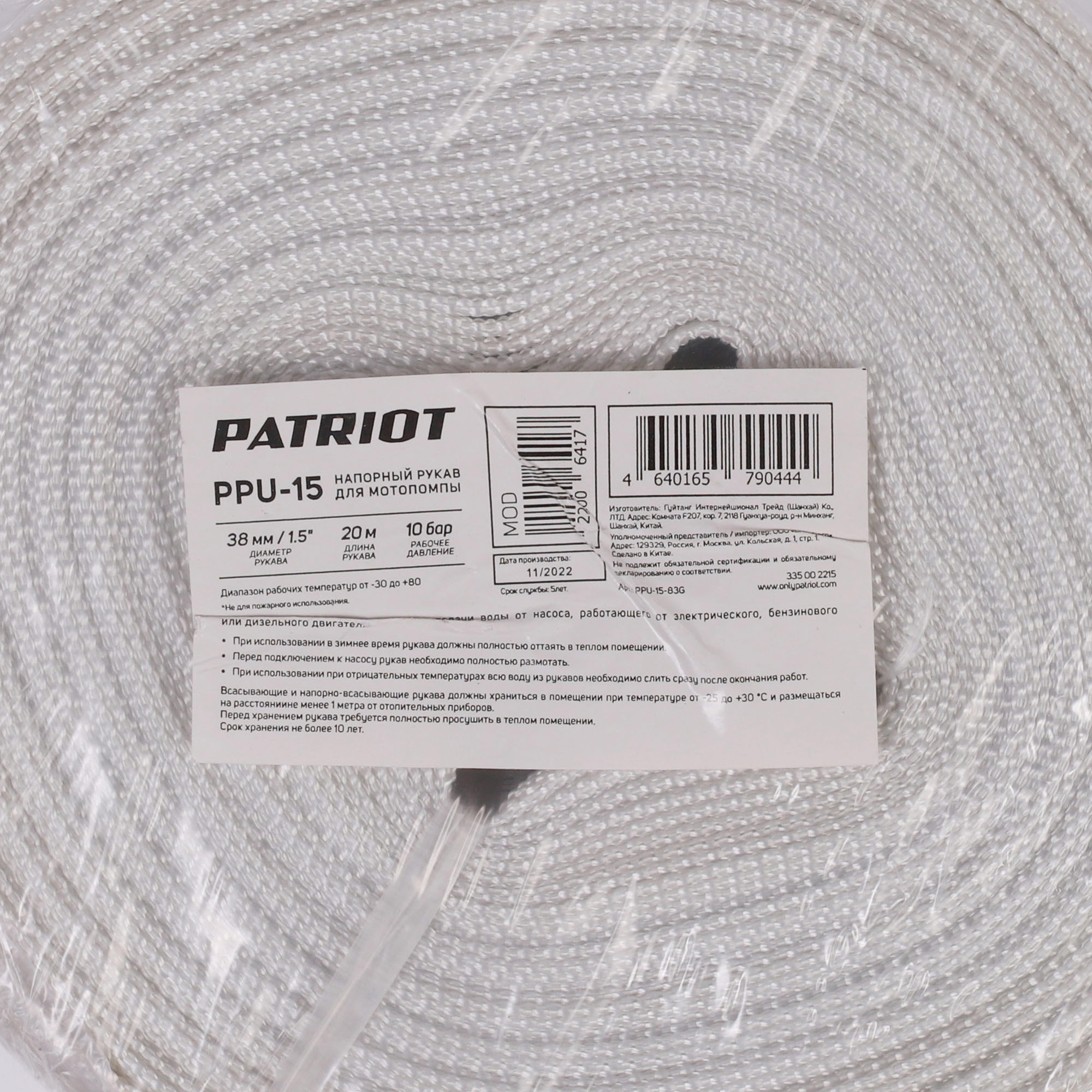Рукав напорный PATRIOT PPU-15 (длина 20м, 38мм - 1,5 дюйм) 335002215