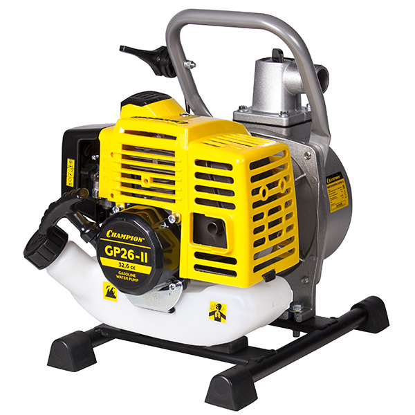 Мотопомпа CHAMPION GP26-II - агрегат для перекачивания и подачи воды на хозяйственные участки и сады. Оснащена одноцилиндровым 2-тактным двигателем мощностью 1.22 л.с., который работает на смеси бензин/масло. Наличие топливного насоса обеспечивает легкий и быстрый запуск мотора. Агрегат установлен на прочную раму из металла для устойчивости на любой поверхности. Вес - всего 7.2 кг. В конструкции предусмотрена рукоятка для транспортировки мотопомпы.