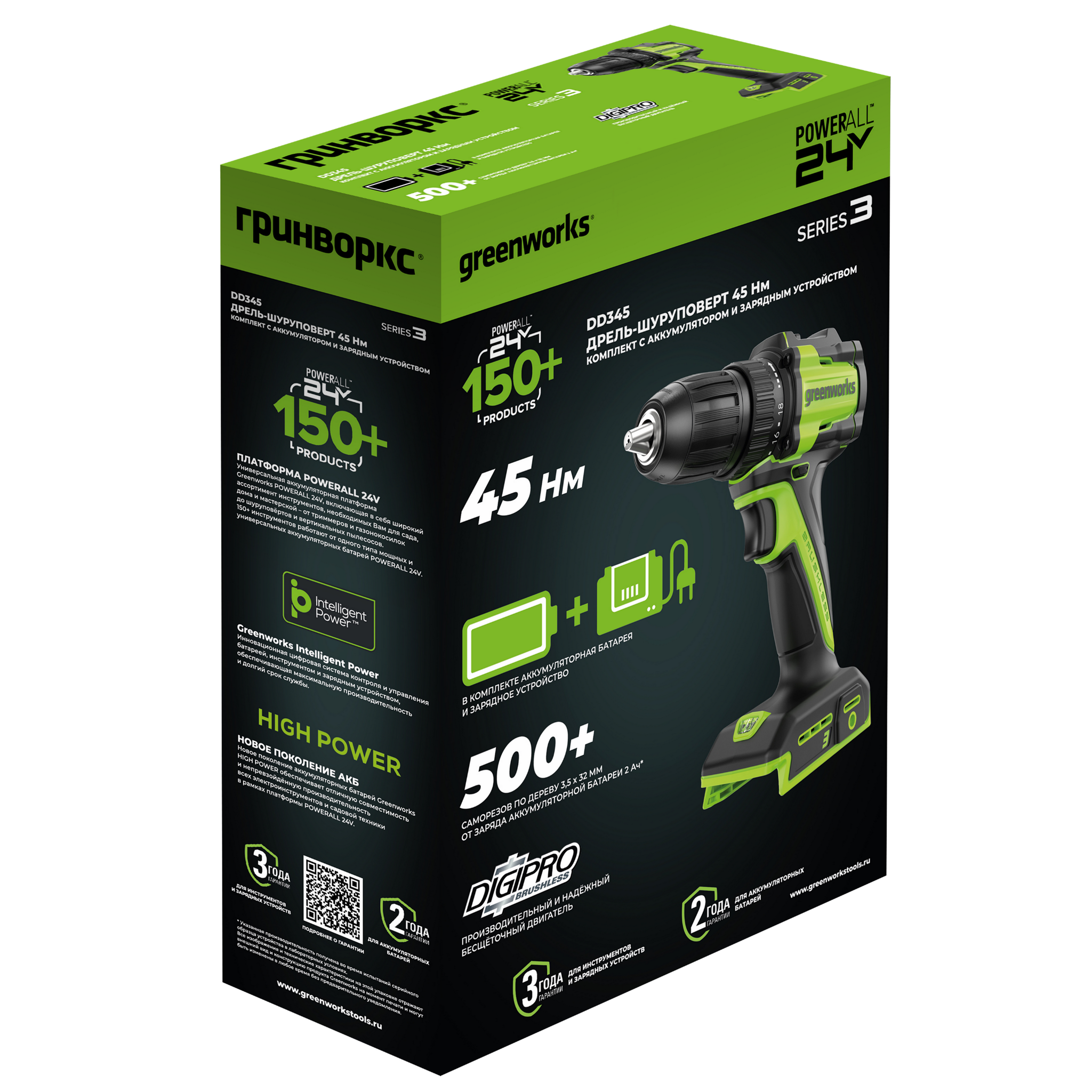 Дрель-шуруповерт акк. Greenworks DD345, 24V, б/щет, 27/45 Нм,13мм,2х2Ач,ЗУ,кор (3708307CUC)