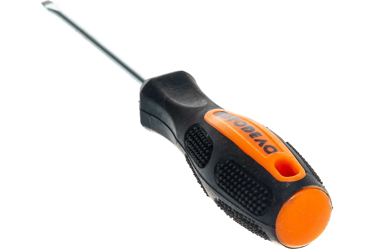Отвёртка шлицевая АВТОДЕЛО. Изготовлена из хром-ванадиевой стали. Стержень закалён, рабочая часть намагничена. Длина стержня 75мм. Ширина рабочей части 5мм. Эргономичная обрезиненная ручка.