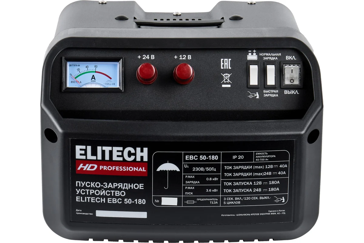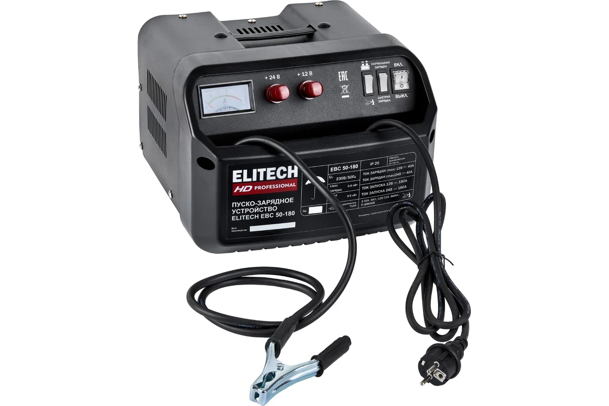 Устройство пуско-зарядн. Elitech EBC 50/180 (12/24В,1.2/7.0кВт,25/40А,40-700Ач,180А,14.5кг) 206814