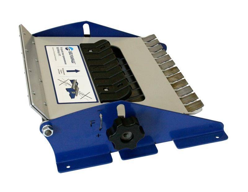 Устройства прижимные предназначены для безопасной обработки при строгании заготовок толщиной менее 63 мм. Выпускаются для всех моделей станков БЕЛМАШ. Обеспечивают равномерное прижатие заготовки к рабочей поверхности и облегчают подачу материала, что улучшает чистоту обработки заготовки. Применяется на станке СДМП-2200. Крепление устройства на станок осуществляется с помощью винтов и шайб. Настройка устройства выполняется с помощью ручки зажима вверху и ручки пружинного блока сбоку в соответствии с требуемой толщиной заготовки или усилием ее прижатия.