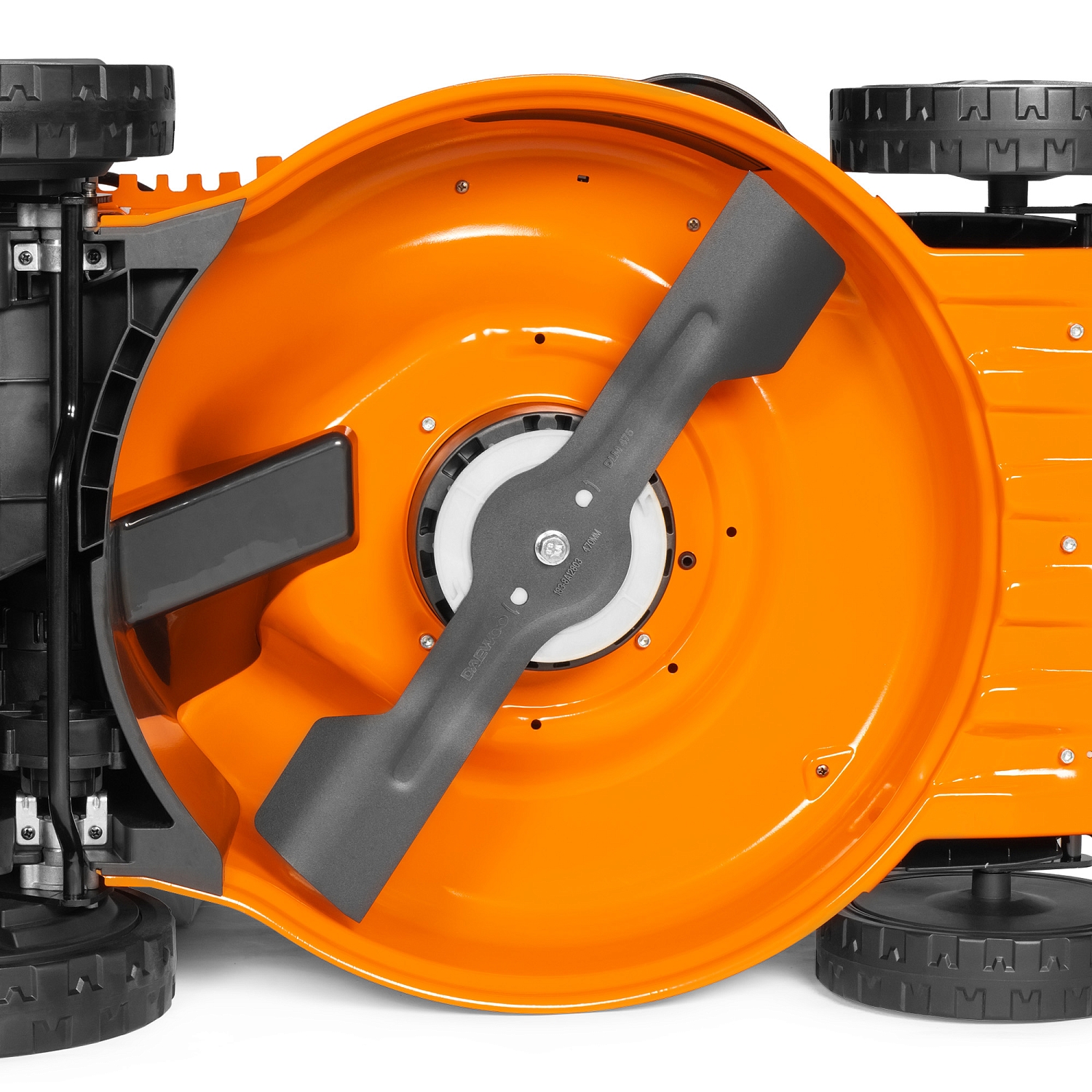 Колеса увеличенного диаметра на подшипниках позволяют косилке легко работать даже на неровных участках и иметь хорошее сцепление с поверхностью. Закрытая внутренняя часть колес предотвращает попадание травы и грязи внутрь механизма колеса.