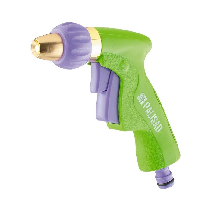 Предназначен для полива на дачных участках, в садах, парках и скверах, а также для очистки. Пистолет-распылитель со штуцерной посадкой и удобным курком, расположенным спереди. Оснащен регулируемой форсункой, что обеспечивает три режима полива: жесткую струю, распыление типа «туман», конусное распыление. Имеет 5-ступенчатый фиксатор курка для непрерывной работы. Совместим со всеми элементами системы полива Palisad и Palisad Luxe. Корпус пистолета изготовлен из цинкового сплава, курок из прочного АБС-пластика, рукоятка залита резиной, что обеспечивает максимальный комфорт при работе с инструментом.